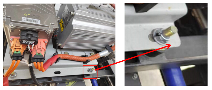When connecting the high-voltage harness, follow the positive and negative markings on the controller. After completing the connections, carefully confirm their correctness before applying high-voltage power. The torque for tightening high-voltage cable terminals is 23NM. When installing the motor controller gland, tighten it until the waterproof seal is evenly squeezed out, leaving 2-3 threads of the gland exposed.