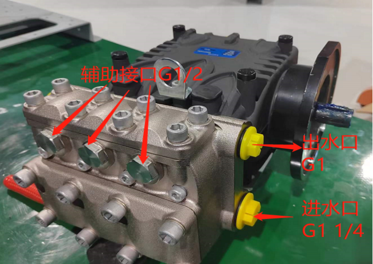 The high-pressure water pump has two inlet ports: G1 1/4”. Two water inlet pipes can be used, or one can be used while blocking the other to prevent the pump from drawing in air. It has two outlet ports: G1”. There are three auxiliary interfaces: G1/2”. The larger port is the inlet, and the smaller port is the outlet.