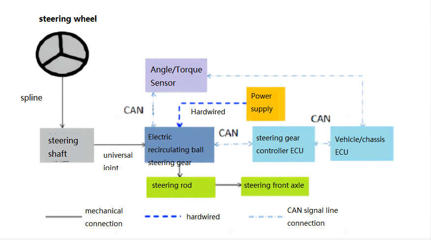The Electric Power Steering (EPS) system for light-duty commercial vehicles mostly uses an electric circulating ball steering gear (as shown in Figure 3), which eliminates components such as an electric hydraulic pump, oil tank, and oil pipe compared to the EHPS system. It has the advantages of a simple system, reduced weight, fast response, and precise control. The power steering has been changed from hydraulic to electric, and the controller directly controls the electric motor to generate power assistance. When the driver turns the steering wheel, the sensor transmits the steering angle and torque signals to the controller. After receiving the steering angle, torque signals, and other information, the controller calculates and outputs control signals to control the electric motor to generate power assistance. When the steering wheel is not turned, the power-assisted steering control unit does not send signals, and the power-assisted motor does not work. The common composition of the electric circulating ball steering system is shown in Figure 4. Currently, YI uses an EPS scheme for self-developed small-tonnage models.