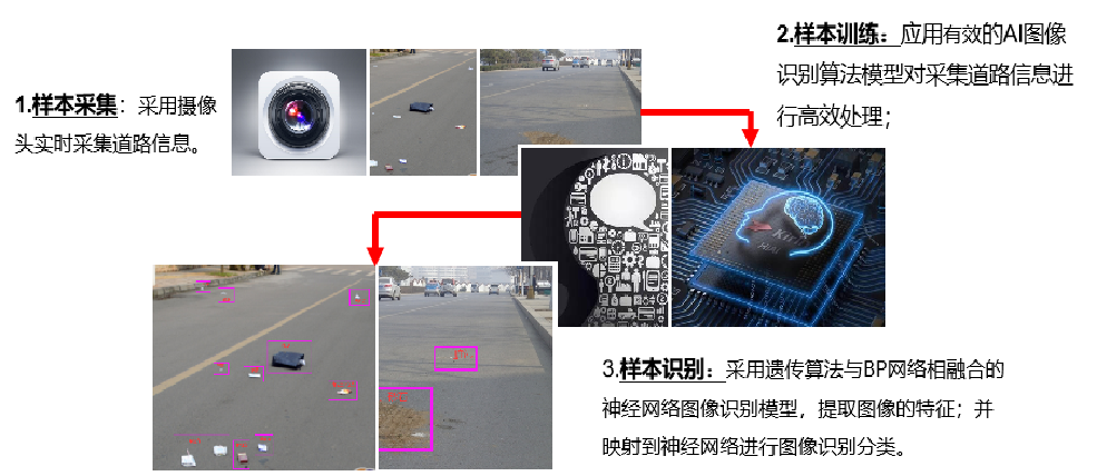 Utilizes edge AI image recognition to identify types of debris on roads, enabling dynamic control of the sweeping system.
